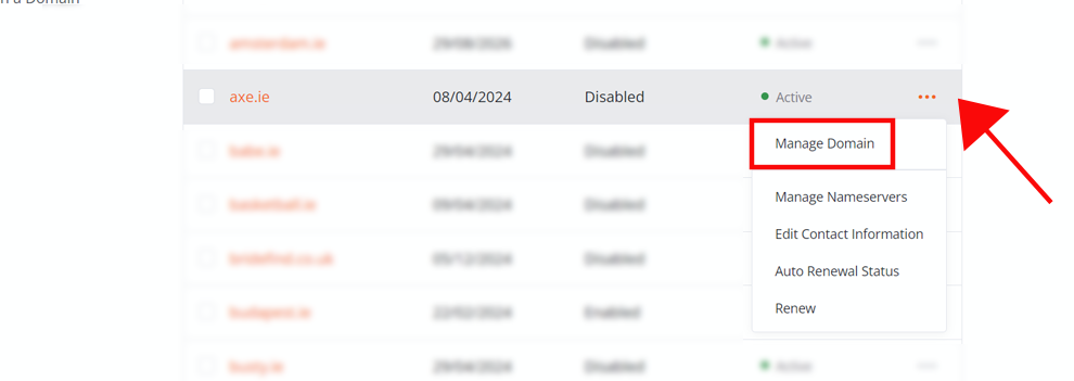 On the domain listings page, you can either click on the domain name or select 'Manage Domain' from the options icon (3 little dots at the end of the domain row) to go to the Domain Management page. (fig 2).